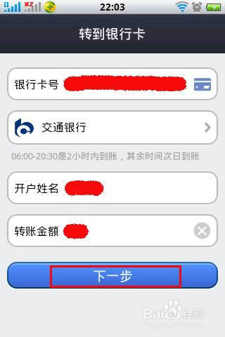 单击【下一步】以后,就会跳出你的确认信息,按照你刚才输入的信息进行核对,把手机号填写进去,转账成功以后就会给你发送信息。单击【下一步】。