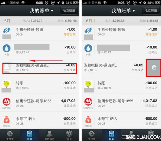 2、进入账单界面后,对其中一个账单进行长按,然后在显示出的界面中点击“删除”按键。这样支付宝钱包账单就删除成功了。