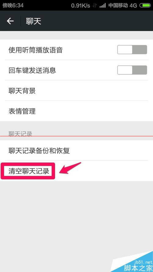 4、聊天界面中点击下方清空聊天记录。当然也可以对聊天记录备份后清空。