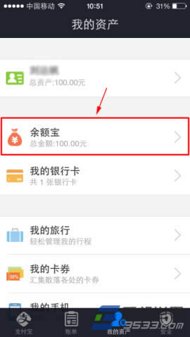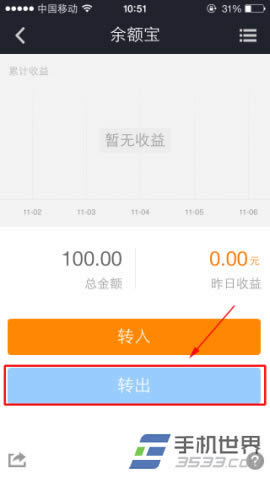 2)在“我的资产”界面点击“余额宝”,在“余额宝”界面点击“转出”。(如下图所示)