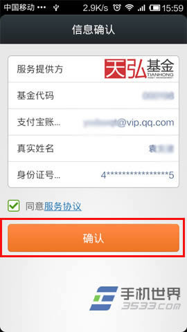 3)点击“体验余额宝”开始余额宝服务开通,大家核对下个人资料后点击“确认”按钮。