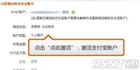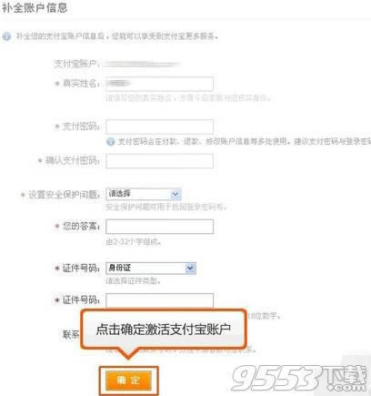 7、按照上述图片上的提示,点击“点此激活”。填写支付宝账号的相关信息。点击确定,则新注册的淘宝账号就和支付宝账号绑定。