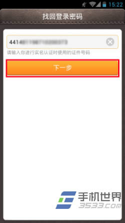 4)输入支付宝认证时填的身份证号码,然后点击“下一步”。(如下图所示)