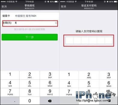三、在零钱提现中,选择好存储卡(也就是选择需要提现到的银行卡,然后输入要提现的金额,完成后点击【下一步】,最后再输入一次支付密码以提现,如下图所示。