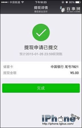 四、完成上一步后,就可以看到微信红包提现申请已经提交的提示了,通常会在一个工作日内到账,下方会显示大概的预计到账时间,只要点击底部的【完成】就可以了。