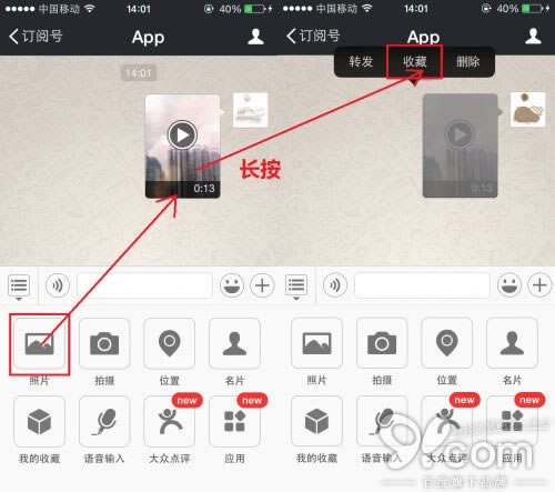 点击发送照片,选择要分享的视频。发送出去后,长按视频,选择收藏。