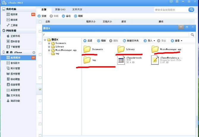 接下来就是利用itools寻找微信了、如图所示 打开应用程序 里面会出现你手机里安装的各种应用程序 然后找到微信。我手机越狱了,安装了5个微信,我叫他撸管神器哈哈。好了不多说继续 找到微信后,看到后面有个浏览。用鼠标点击浏览 打开如下图,我的这么多微信,我就用今天和一妹纸聊天的微信聊天记录来说吧