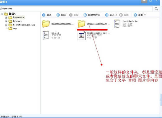 如图 打开以后会出现四个文件夹 分别是 Documents Library MircroMesssenger.app 和tmp等四个文件 我们要找的聊天内容就在第一个文件 Documents里面 现在打开后发现又有两或者多个个文件夹