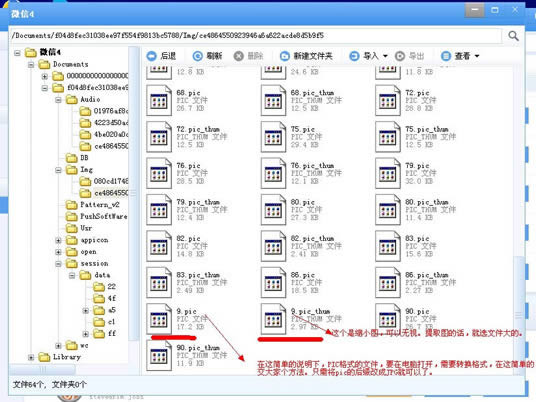 1、首先微信最常用的的就是图片了。但是微信里面的图片格式是pic的,这里还有一个简单地方法就是把微信的图片保存到手机,然后用数据线传到电脑。 但是如果没法传的话,就从聊天记录里翻看的话,需要将PIC格式转化成JPG或者gif等格式。在这建议转换成jpg。大家可以百度下pic转jpg文件软件。这个比较复杂,推荐个简单的方法直接把pic后缀改成jpg。就是右键重命名文件 将pic改成jpg