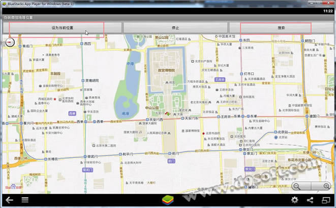 然后就可以在地图中选择伪装的地理位置了,如果在地图中找不到,可以利用搜索功能。但是因为模拟器中没有安装中文输入法,所以只能输入英文。选择好之后单击“设为当前位置即可”。