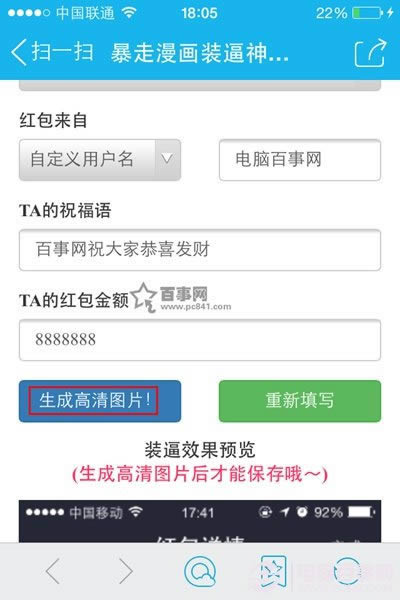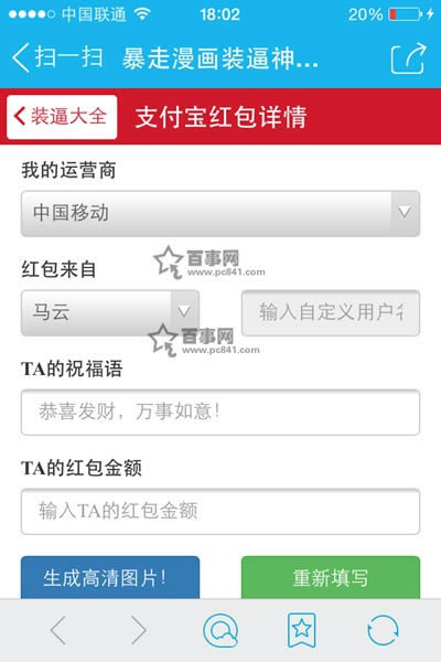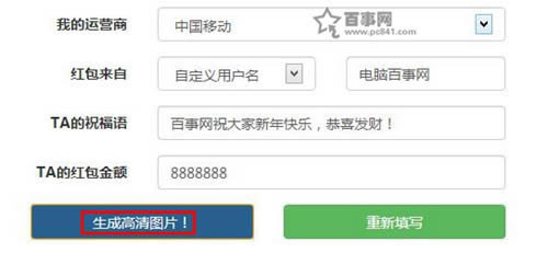 3,接下来的流程过程和电脑端的方法一样,需要填写网络运营商,红包来自何人等待相关信息,填写完之后点击【生成高清图片】,如下图所示: