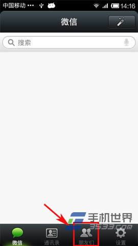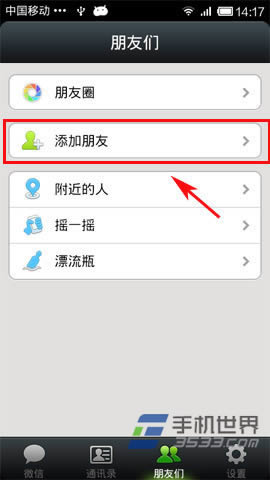 2)进入微信后,点击最下方的“朋友们”按钮,在“朋友们”菜单里选择“添加朋友”。(如下图所示)