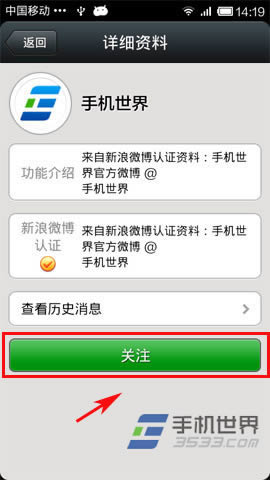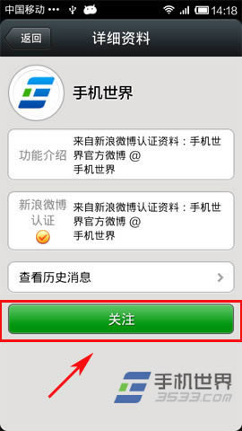 4)在搜索出来的结果里,点击自己想要的公众平台账号进入,点击该公众平台账号资料界面最下方的“关注”按钮进行关注即可。(如下图所示)