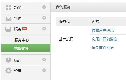 所有账号在申请之后,都将获得基础接口的权限,基础接口中将包括接收用户消息,向用户回复消息,接受事件推送等三种服务。