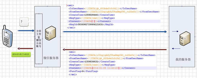 从上图可以看出,用户在发送一个?后,微信服务器将组装一个消息发送给我们自己的服务器,自己的服务器然后回复一个时间,并且将该时间也按一定的规则组装,回复给公众账号,公众账号再回复给用户,在这个收发过程中,发送方和接收方进行了调换(ToUserName和FromUserName值互换),收发都是以xml格式在后台进行传输的,