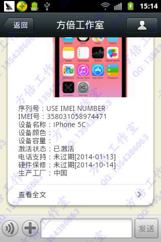 <xml> <ToUserName><![CDATA[oIDrpjqASyTPnxRmpS9O_ruZGsfk]]></ToUserName> <FromUserName><![CDATA[gh_680bdefc8c5d]]></FromUserName> <CreateTime>1359011899</CreateTime> <MsgType><![CDATA[news]]></MsgType> <Content><![CDATA[]]></Content> <ArticleCount>1</ArticleCount> <Articles> <item> <Title><![CDATA[[苹果产品信息查询]]></Title> <Description><![CDATA[序列号:USE IMEI NUMBER IMEI号:358031058974471 设备名称:iPhone 5C 设备颜色: 设备容量: 激活状态:已激活 电话支持:未过期[2014-01-13] 硬件保修:未过期[2014-10-14] 生产工厂:中国]]> </Description> <PicUrl><![CDATA[http://www.doucube.com/weixin/weather/icon/banner.jpg]]></PicUrl> <Url><![CDATA[]]></Url> </item> </Articles> <FuncFlag>0</FuncFlag> </xml>