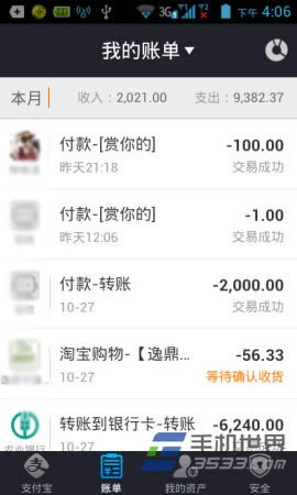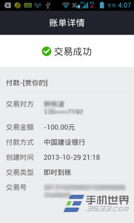 2)进入我的账单就是这个月的你的收入和支出情况,包款交易成功与否,打开其中一条交易记录后,可以看到账单详情。(如下图所示)