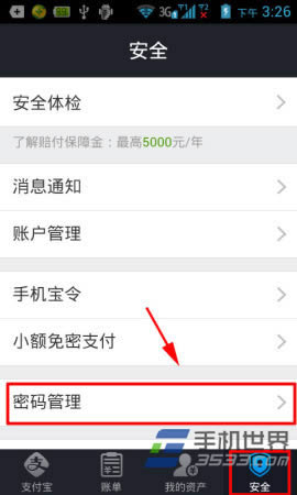 1)打开手机支付宝软件,进入支付宝后点击安全,然后在安全栏里找到并点击“密码管理”。(如下图所示)