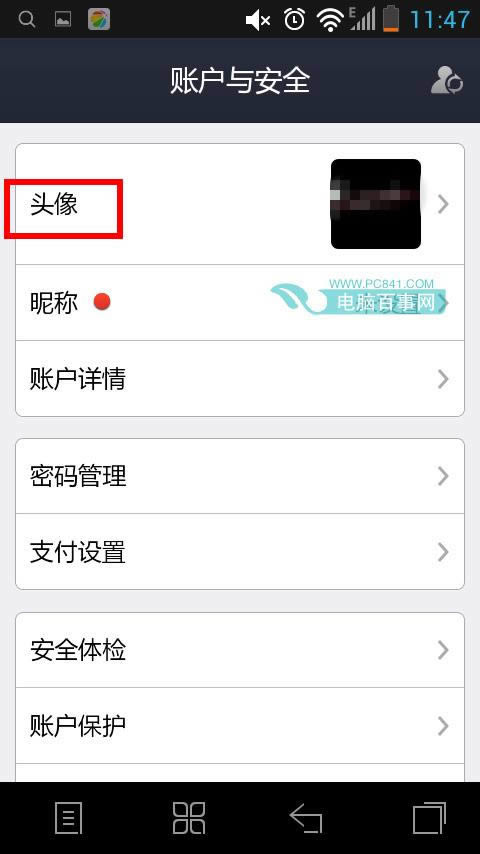 二,随后,点击“”账户名一栏,也就是自己的支付宝名称或者头像,之后进入账户与安全界面之后,再点击文字“头像”进入支付宝头像设置,如下图所示: