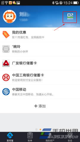 1)打开支付宝钱包,在首页点击右上角的“扫码”图标。(如下图所示)