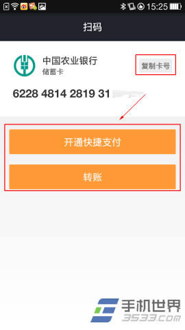 3)将银行卡正面放到支付宝扫码能扫到的区域,记住,要对齐扫码的边缘,这样才能识别。识别出来后会显示开户银行信息。可以选择“复制”,“开通快捷支付”,“转账”三种方式。(如下图所示)