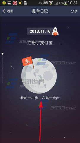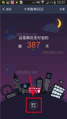 1)首先打开支付宝钱包,在首页中间点击【算账的时候到了】,在界面能看用户使用支付宝的天数,在下方点击【翻开日记】。