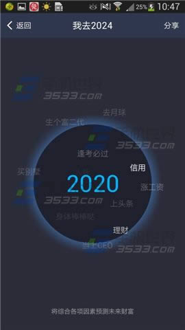 4)在界面可以开启预测未来财富,最后显示十年之后用户将会拥有的金额或者还可以分享给好友。