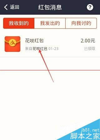 3、在红包消息界面里的我收到的红包里就可以看到我们要查看的花呗红包了,点击花呗红包可以查看详情。如下图所示。