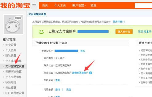 5、进入我的淘宝在绑定状态处——点击(解绑或更换账户)