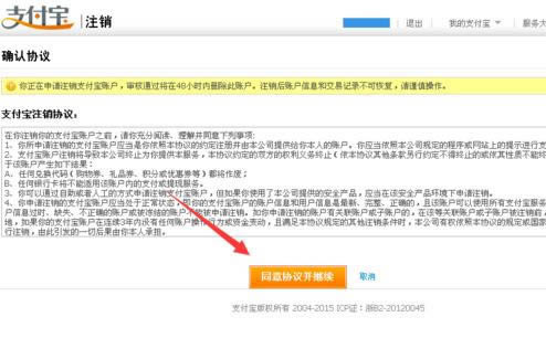 8、阅读支付宝注销协议——点击(同意协议并继续)