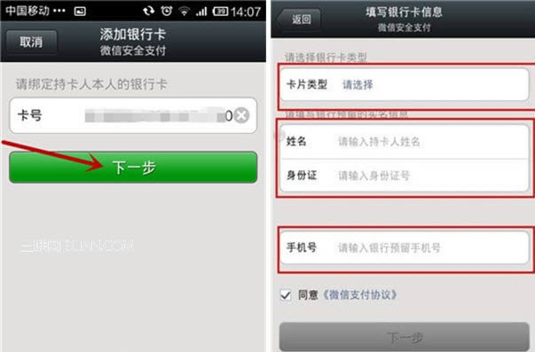 3、【添加您的银行卡号】,下一步。输入银行卡类型、银行预留持卡人姓名、身份证、手机号等个人信息。(如下图所示)。