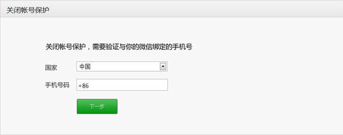 2、关闭帐号保护,输入与您的微信绑定的手机号;