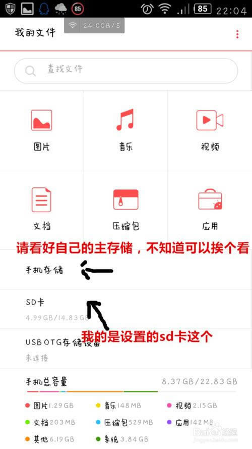 接下来就是要用到“文件管理器”的时候了,切换到文件管理器,如图1我的叫“我的文件”(最后一个),打开,说明的是,你要找到你手机的主存储是哪个,手机型号不一样可能存储的地方不一样(图2),打开主存储目录,往下翻