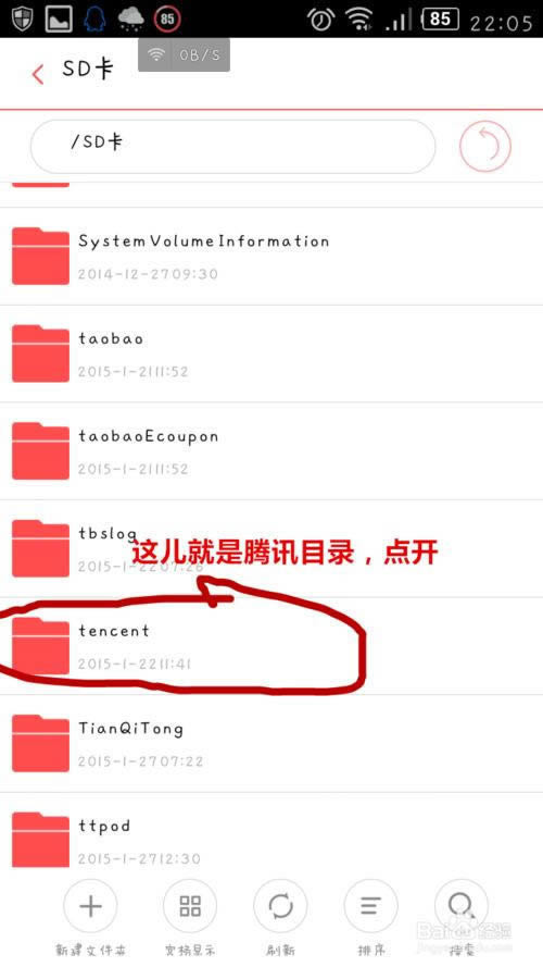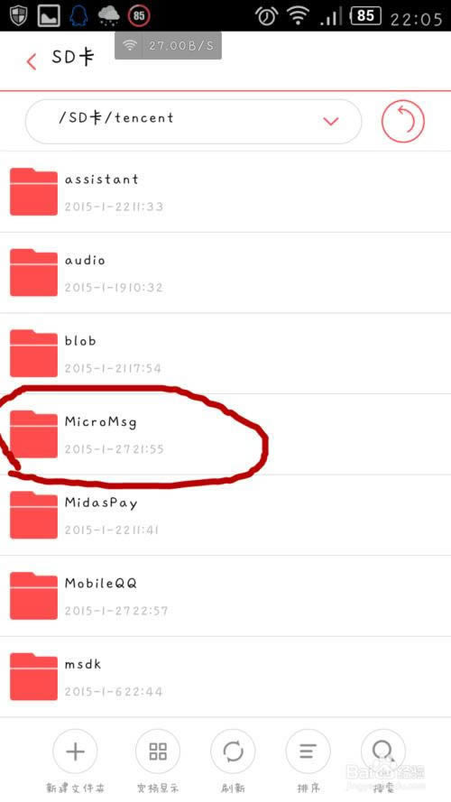 往下翻看目录找到“tencent”文件夹,点开,找到“MicroMsg”文件夹,这个就是微信的文件夹
