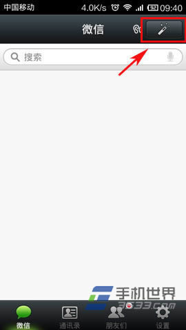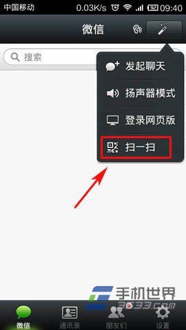 3)现在回到手机微信上,进入微信后,点击微信右上角的菜单栏,在弹出的菜单栏里选择“扫一扫”功能。(如下图所示)