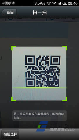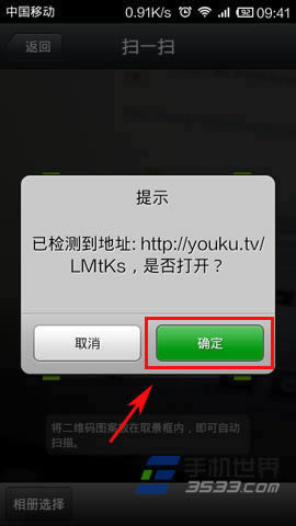 4)进入微信“扫一扫”功能后,对准原先优酷二维码界面上的二维码进行扫描,点击扫描结果确定进入。(如下图所示)