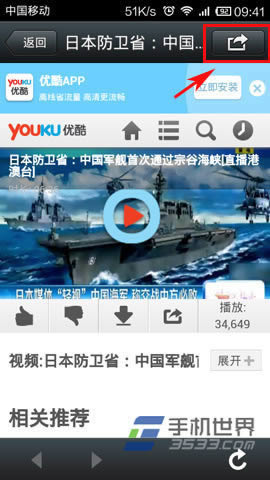 1)在观看优酷视频的时候,看到有趣的视频想分享时,只需要点击优酷视频最下方的分享到微信的按钮。(如下图所示)
