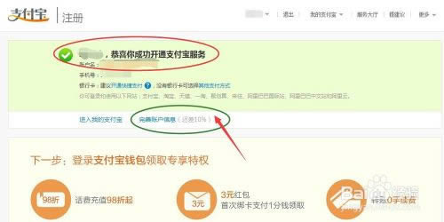 5、在这里如果先不填写银行信息的话,可以点击先跳过这一步,到此就算是注册成功了,弹出支付宝开通服务的页面,还可以进一步完善账户信息