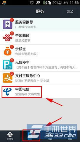 1)首先打开“支付宝”,然后在“服务”中运营商的公众号中点击进去,小编使用的是电信的手机,就为“中国电信”为例了。(如下图所示)