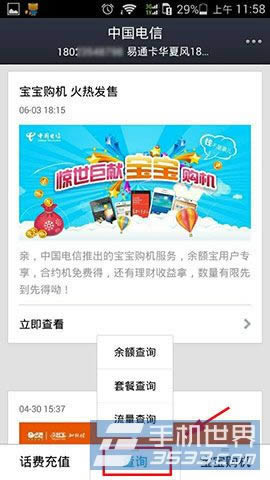 3)然后输入需要绑定的手机号码,输入验证码,点击“绑定”,绑定成功手机号码之后,返回“中国电信”的页面,然后在下方的“查询”中点击进去。(如下图所示)