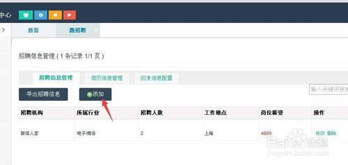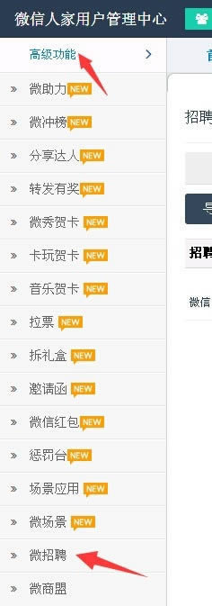 3,进去功能管理,找到高级功能-微招"聘",招聘信息管理,点添加。