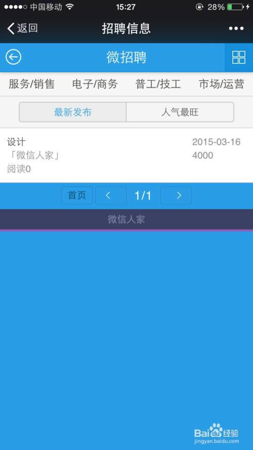 6,手机打开微信,回复找工作关键词,即会显示设置的内容。企业可以发布招"聘"信息,个人可以发布求职信息,有人求职的话,后台可以导出表格。