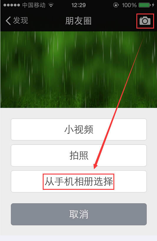 2.点右上角相机图标发表说说(以发表图文说说为例,小视频目前不能同步),选择从手机相册选择