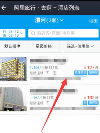 此时在搜索结果中会显示当前城市所 支持信用住的酒店列表,点击选择需要住宿的酒店