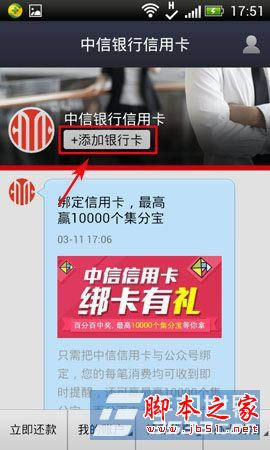 2)在进入中信银行信用卡界面,点击“添加银行卡”按键,在进入添加银行卡界面,输入相关信息后,按“绑定”按键即可。(如下图所示)