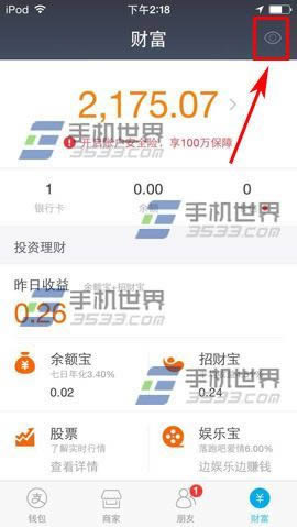 2)跳转到财富页面后,点击右上角的【眼睛】图标,可以看到“眼睛”闭上了,这是财富明细就可以隐藏了哦。(如下图)