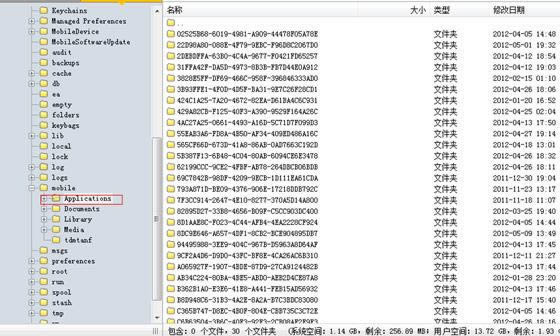然后是mobile文件夹,然后是applications文件夹,你所有用的应用程序都装在这里了~~。你要找到微信的文件夹。