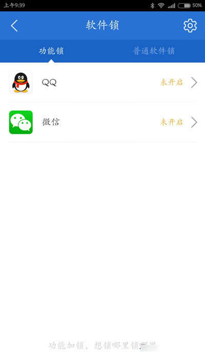 4、进去软件锁后,我们看到这里有功能锁和普通软件锁两部分,功能锁就是锁QQ和微信的,一般软件锁是针对其他应用。我们点击微信进去加密