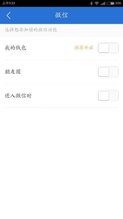 5、进去后我们看到腾讯手机管家对于微信隐私的保护很到位,将隐私细分为:我的钱包、朋友圈和进入微信时三部分,这是我们自己的需要设置即可