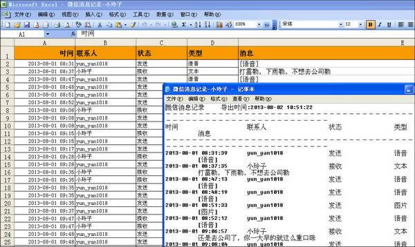 步骤3:导出微信聊天记录是用户最关心的一类应用,同步助手当然也具备此功能。而且我们可以分类型导出。文本消息内容通过界面左上方的导出按钮就可以办到。软件提供了TXT和Excel两种存储方式,如图3所示。相比较而言,Excel方式更方便后期的查询。